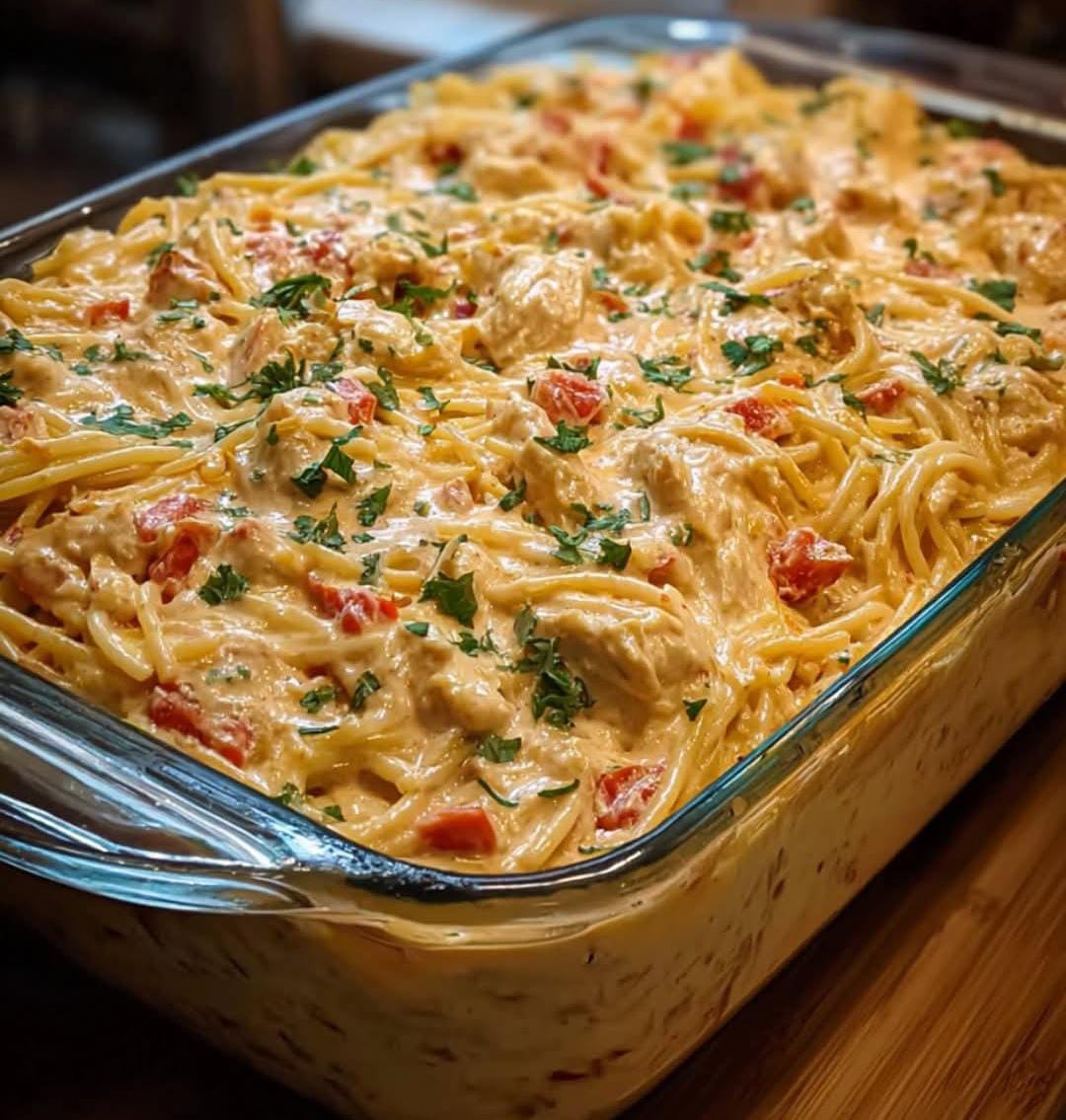 CREAMY ROTEL CHICKEN SPAGHETTI CASSEROLE